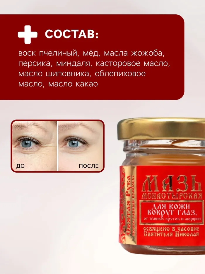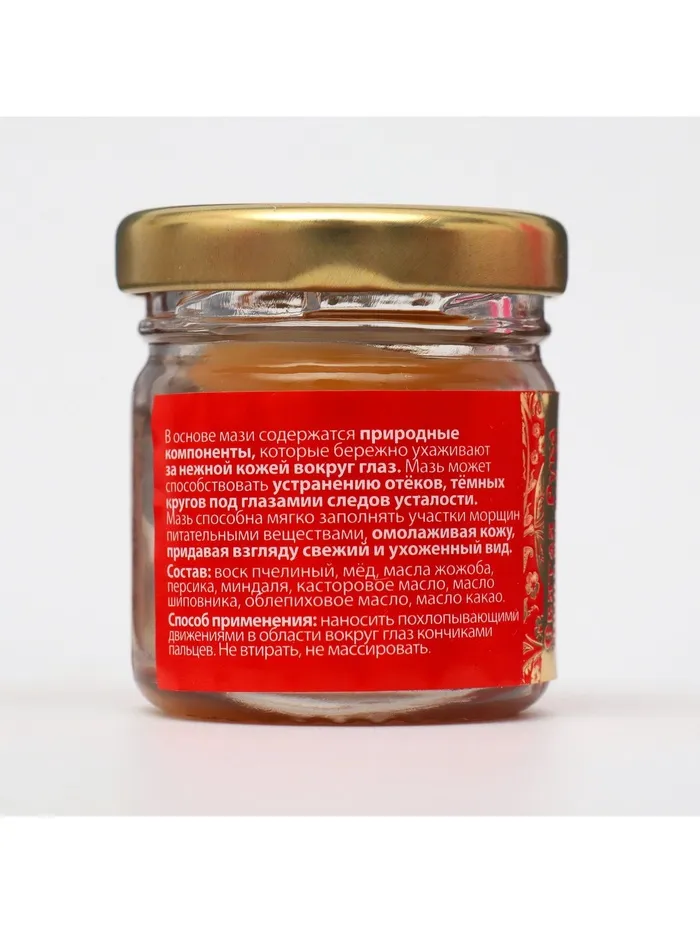 В основе мази содержатся природные компоненты, которые бережно ухаживают за нежной кожей вокруг глаз. Мазь может способствовать устранению отёков, тёмных кругов под глазами следов усталости. Мазь способна мягко заполнять участки морщин питательными веществами, омолаживая кожу, придавая взгляду свежий и ухоженный вид.