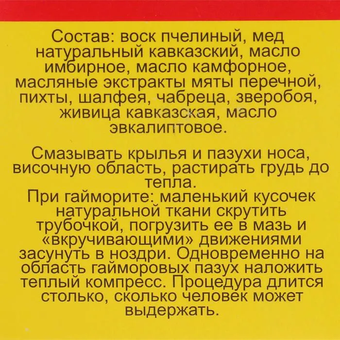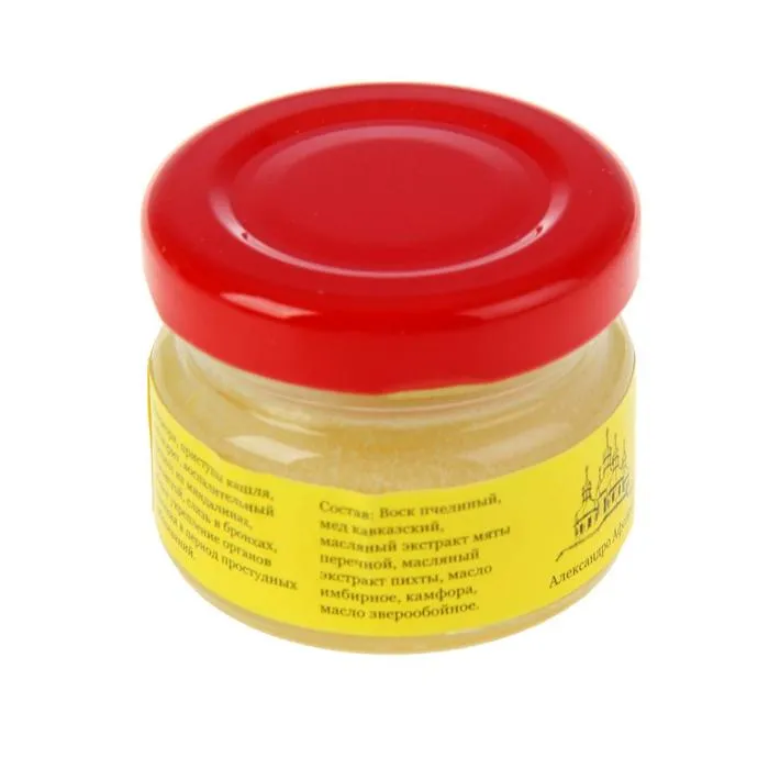 Состав: воск пчелиный, мёд натуральный кавказский, масляный экстракт мяты перечной, масляный экстракт пихты, масло имбирное.
