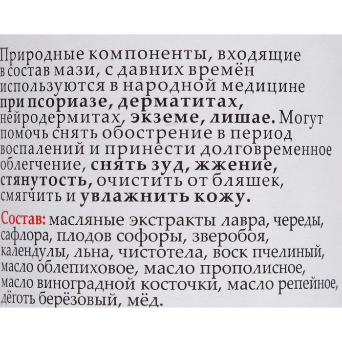 Состав: масляные экстракты лавра, череды, сафлора, плодов софоры, зверобоя, календулы, льна, чистотела, воск пчелиный, масло облепиховое, масло прополисное, масло виноградной косточки, масло репейное, деготь берёзовый, мёд.