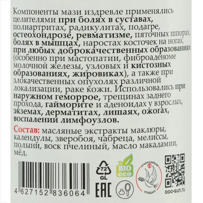 Природные компоненты, входящие в состав мази, с давних времен используют при болях в суставах, полиартритах, радикулитах, подагре, остеохондрозе, ревматизме, пяточных шпорах, болях в мышцах, наростах косточек на ногах, при любых доброкачественных образованиях (особенно при мастопатии, фиброаденоме молочной железы, узловых и кистозных образованиях, жировиках), а также при злокачественных опухолях различной локализации, раке кожи.