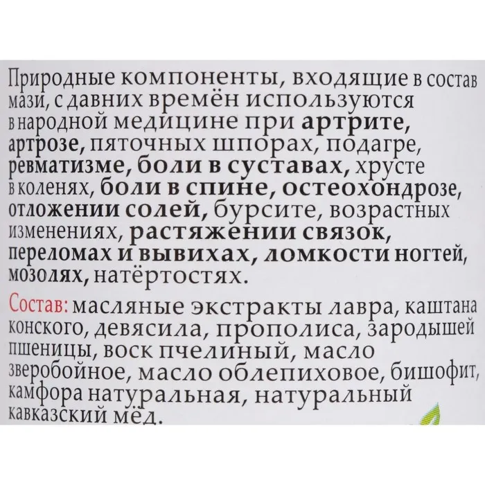 Состав: масляные экстракты лавра, каштана конского, девясила, прополиса, зародышей пшеницы, воск пчелиный, масло зверобойное, масло облепиховое, бишофит, камфора натуральная, мёд.