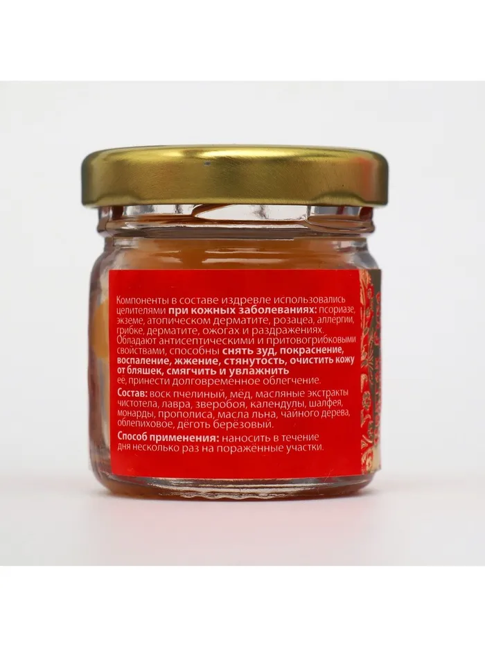 Состав: воск пчелиный, мёд, масляные экстракты чистотела, лавра, зверобоя, календулы, шалфея, монарды, прополиса, масла льна, чайного дерева, облепиховое, дёготь берёзовый.