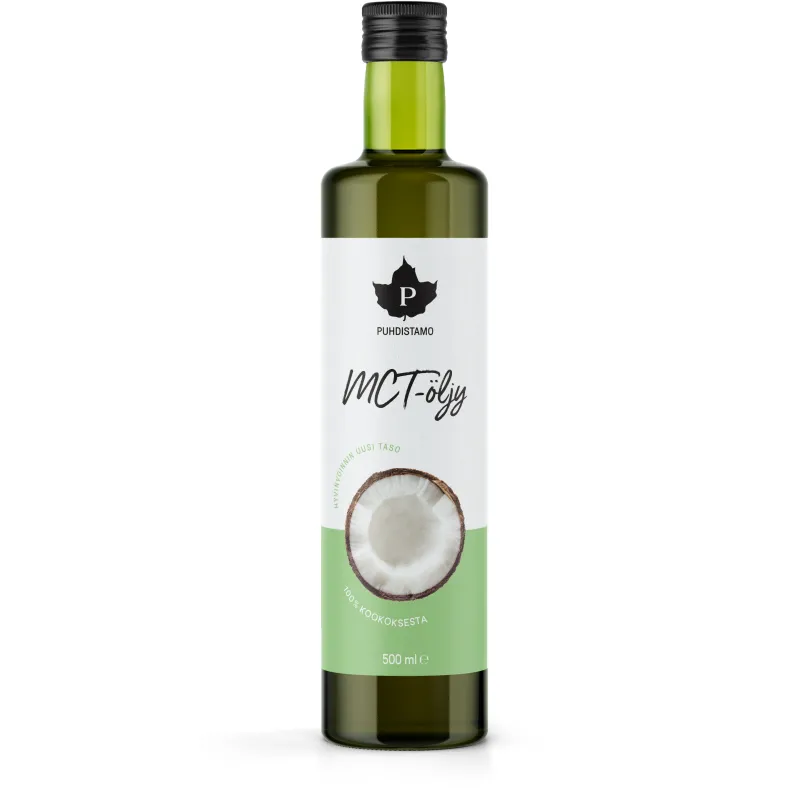 MCT масло Puhdistamo – это бесцветное, безвкусное и без запаха масло, которое легко использовать в любых блюдах или напитках. Хотя MCT масло отлично переносит высокие температуры, его не рекомендуется использовать для жарки. Объем упаковки 500 мл. Мы постоянно обновляем информацию о продукте и рекомендуем всегда проверять данные на упаковке.