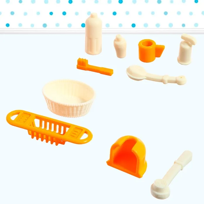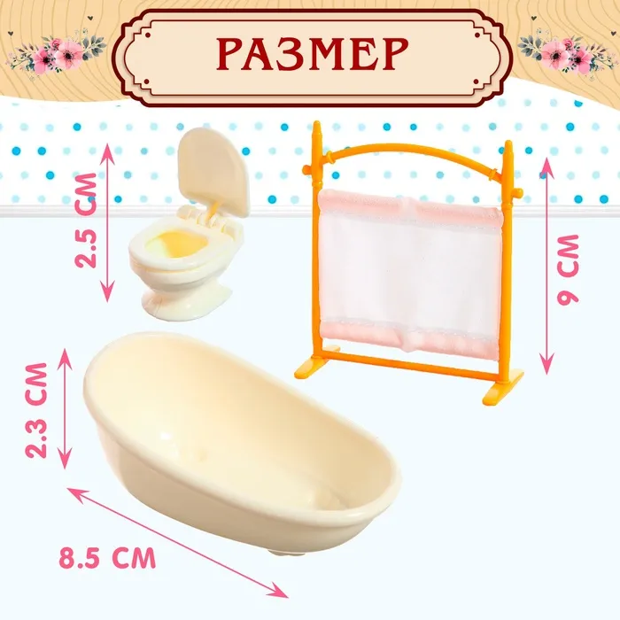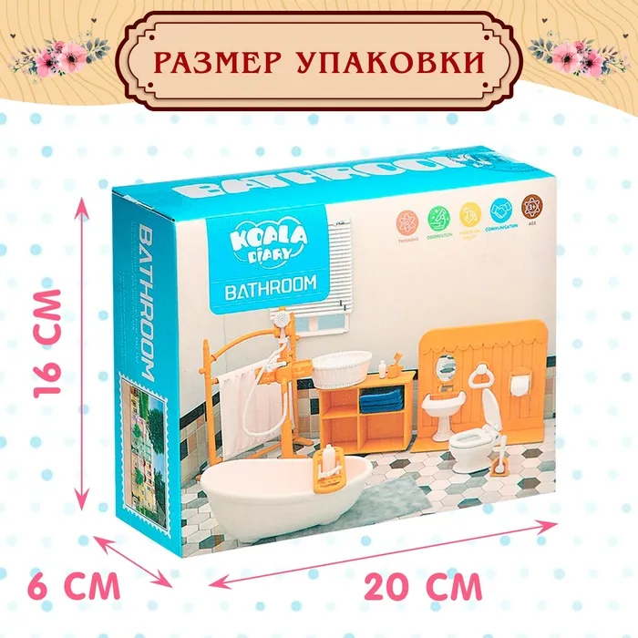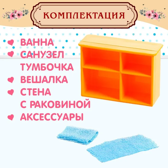 - Аксессуары: ёршик, полотенца, корзинка, тюбики уходовых средств (имитация), зубная щётка, мочалка, стакан.