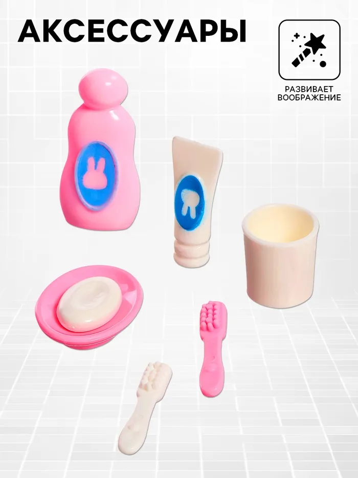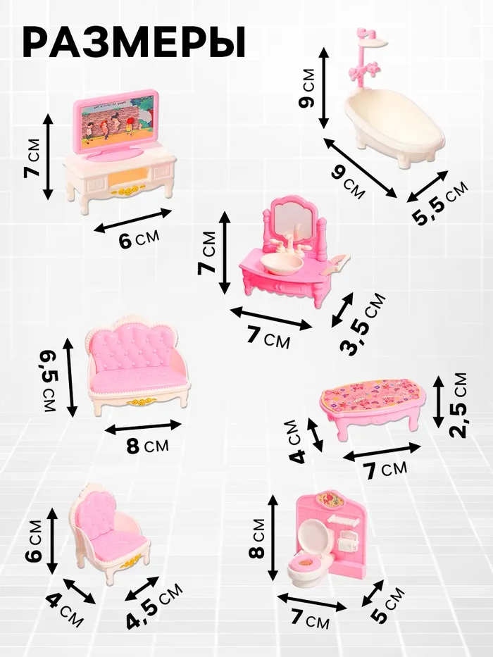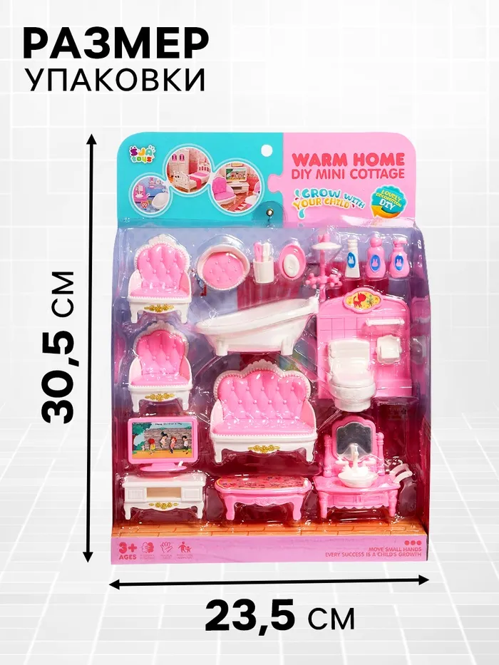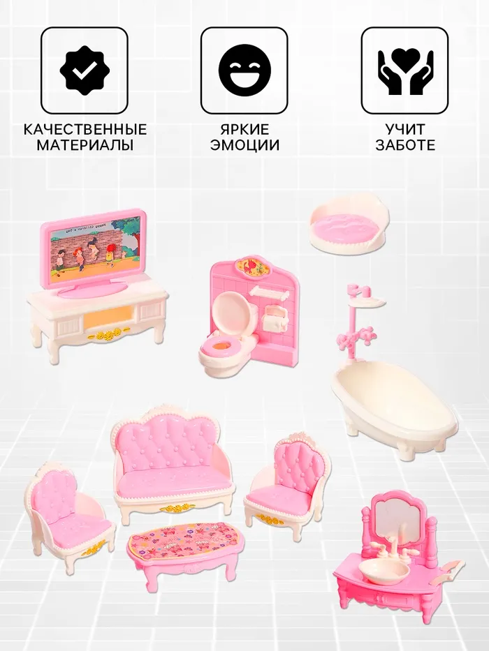 Мебель для кукол — это незаменимый набор для создания уютного кукольного домика. Комплект включает 16 предметов, которые подойдут для обустройства ванной комнаты и гостиной. Простые формы и приятные цвета сделают игру ещё интереснее.