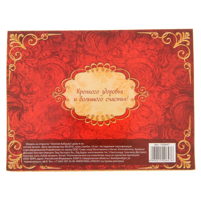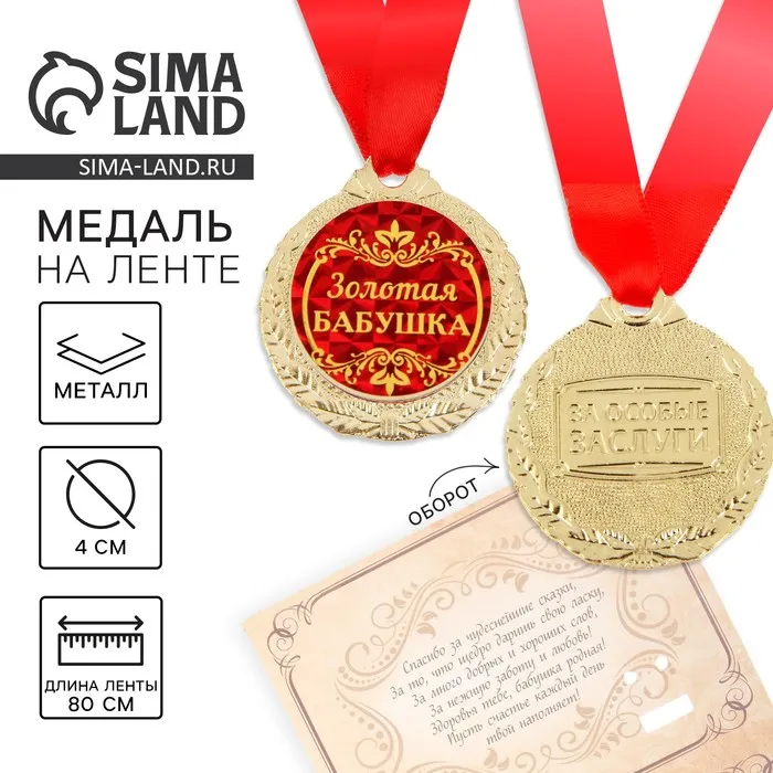 Медаль на открытке «Золотая бабушка», d=4 см — хороший подарок и отличная награда! Она будет долго радовать владельца и привлекать к нему заслуженное внимание. Лента, которая входит в комплект, позволит незамедлительно использовать аксессуар по назначению.
