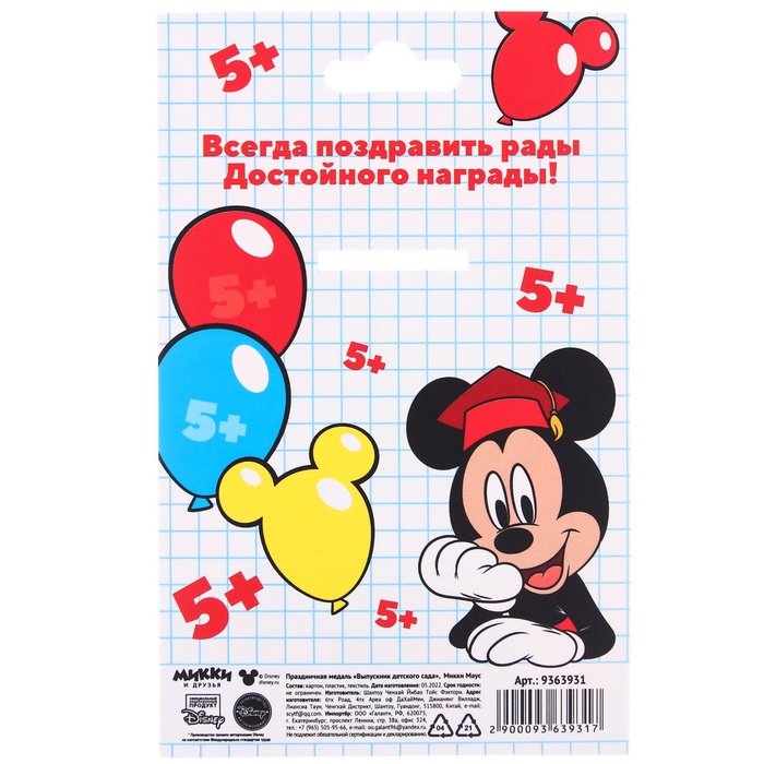 Медаль на выпускной «Выпускник детского сада», 5.6 см, Микки Маус — Характеристики