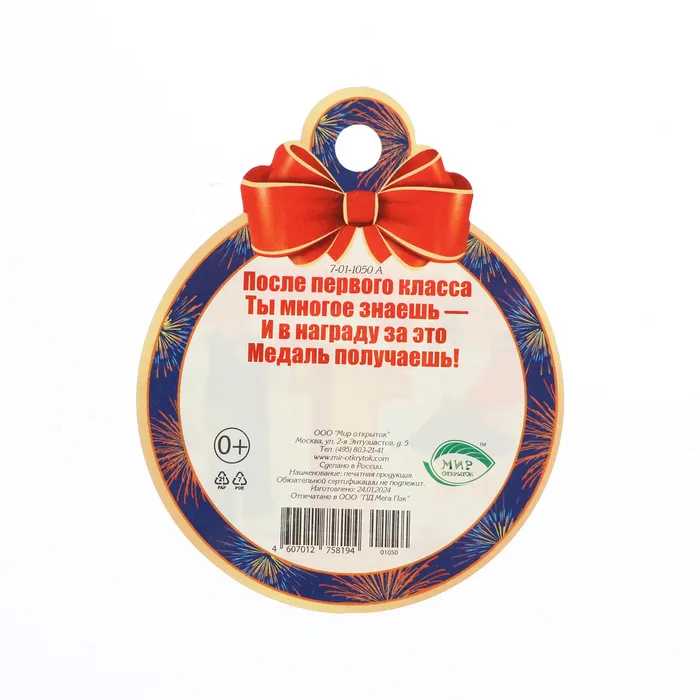 Медаль на выпускной «Выпускник первого класса!», 10×10 см — Характеристики