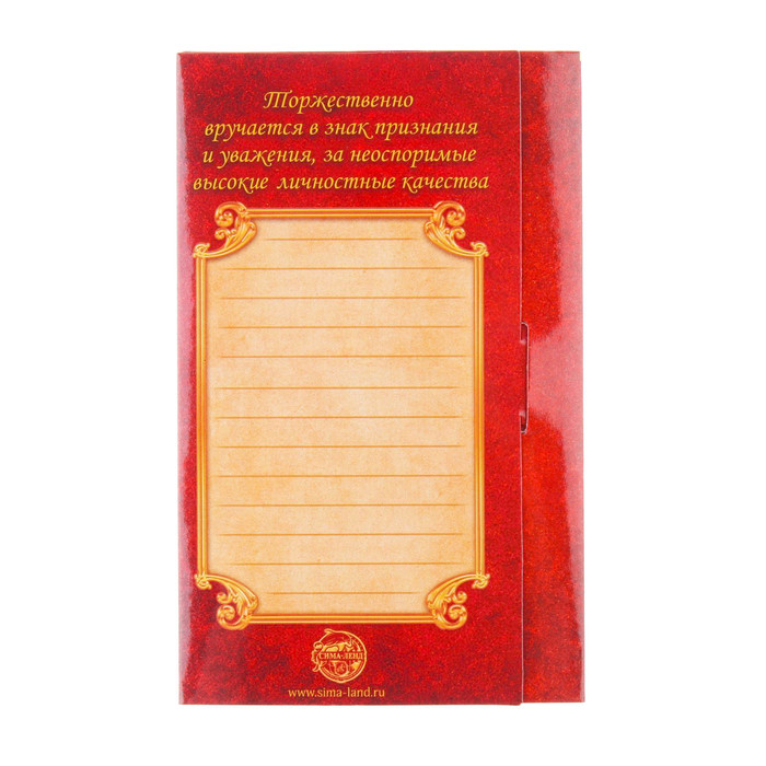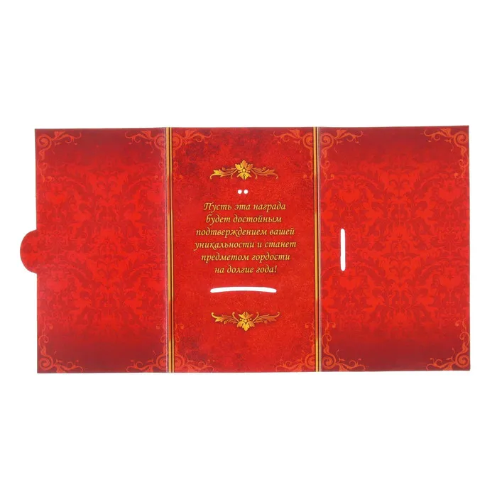 Награда аккуратно размещена на картонной подложке с поздравлением, наполненным тёплыми словами, и дополнена нарядной лентой.