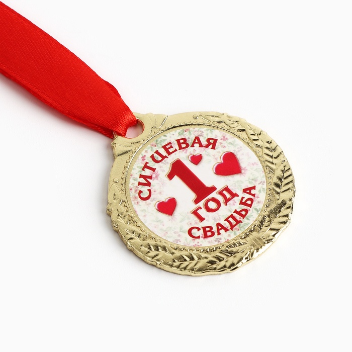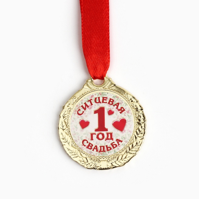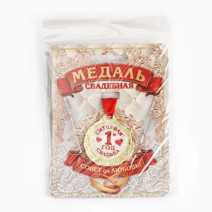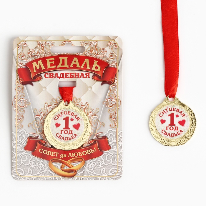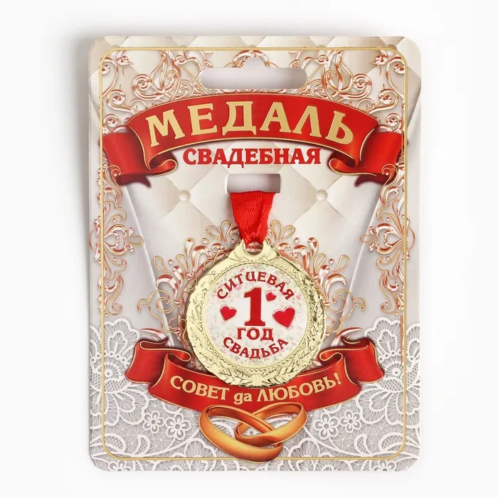 Хотите поздравить супругов с годовщиной брачной жизни по-особенному? Медаль свадебная на открытке «1 год ситцевая свадьба», d=4 см подчеркнёт торжественность данного события. Награда изготовлена из металла золотого цвета и дополнена красной лентой.