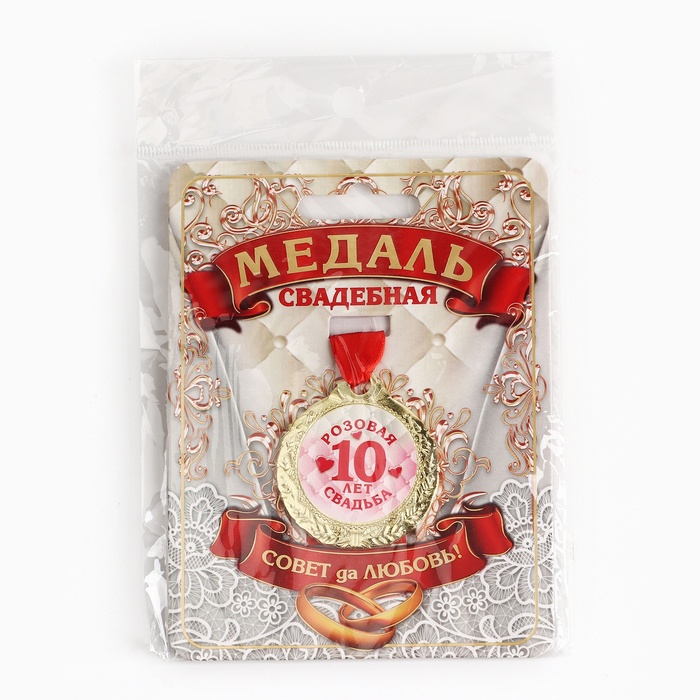 Хотите поздравить супругов с годовщиной брачной жизни по-особенному? Медаль свадебная на открытке «10 лет розовая свадьба», d=4 см подчеркнёт торжественность данного события. Награда изготовлена из металла золотого цвета и дополнена красной лентой.