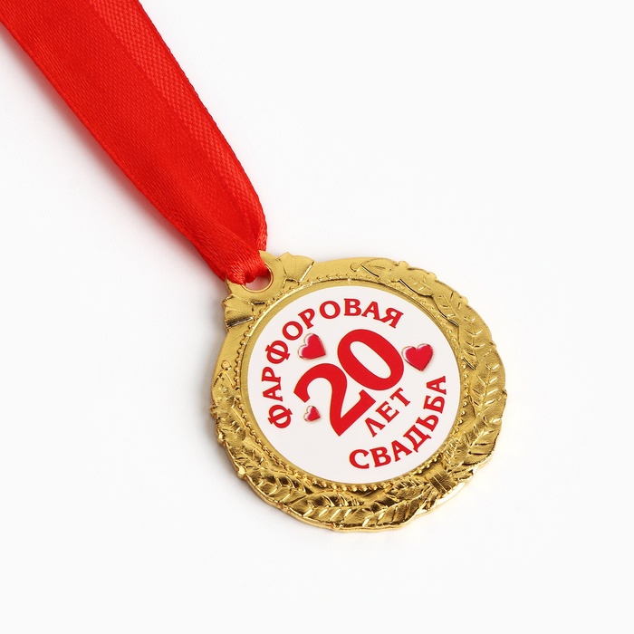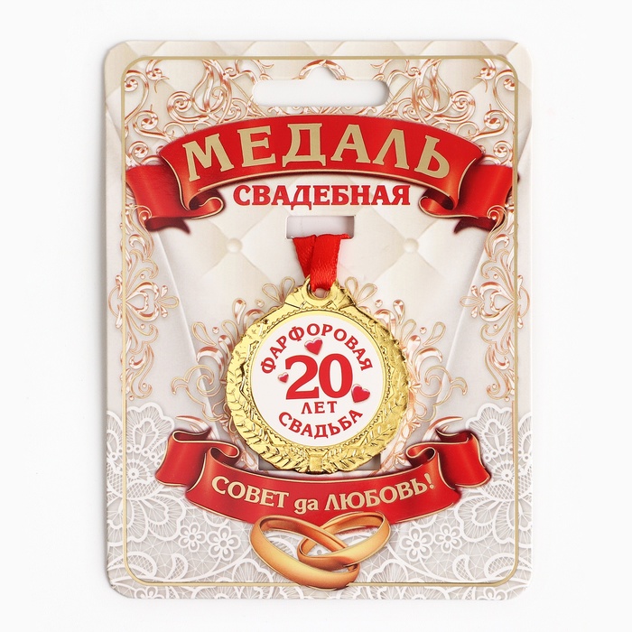 Хотите поздравить супругов с годовщиной брачной жизни по-особенному? Медаль свадебная на открытке «20 лет фарфоровая свадьба», d=4 см подчеркнёт торжественность данного события. Награда изготовлена из металла золотого цвета и дополнена красной лентой.