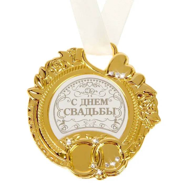 У ваших близких, друзей или родных намечается свадьба? Этот прекрасный сувенир поможет сделать поздравление ещё более душевным и запоминающимся. Награда эксклюзивной формы изготовлена из металла под золото и украшена великолепными сияющими стразами. Она преподносится на нежной оригинальной резной открытке с золотым тиснением. Внутри вы найдёте красивые искренние поздравления, написанные специально по случаю этого торжественного и важного дня!