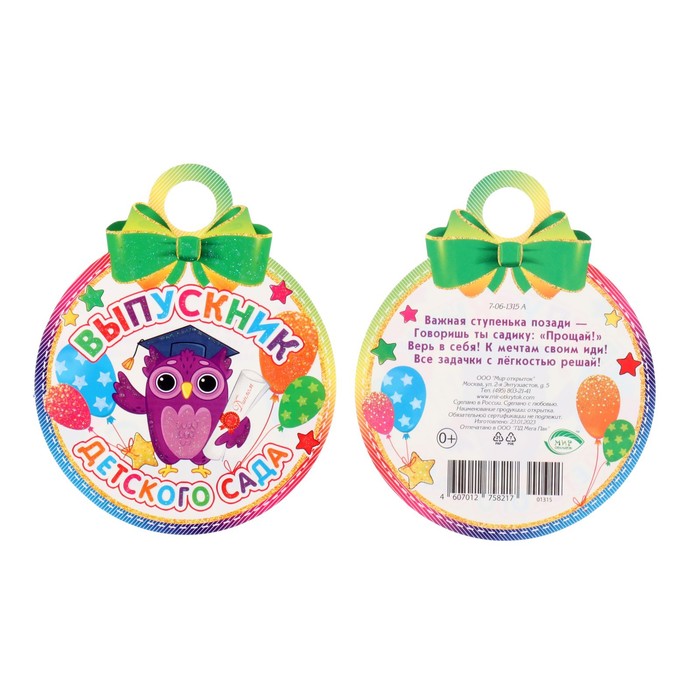 Медаль "Выпускник Детского сада!" глиттер, сова, 10х10 см — Характеристики