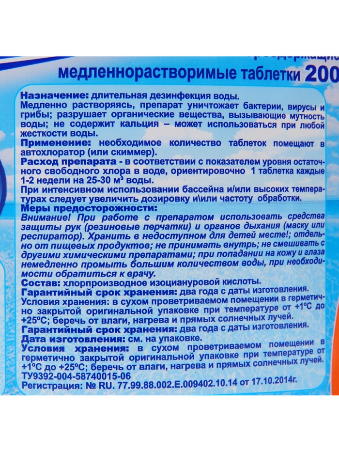 Расход препарата: ориентировочно 1 таблетки каждые 1-2 недели на 25-30 кубических метров воды.