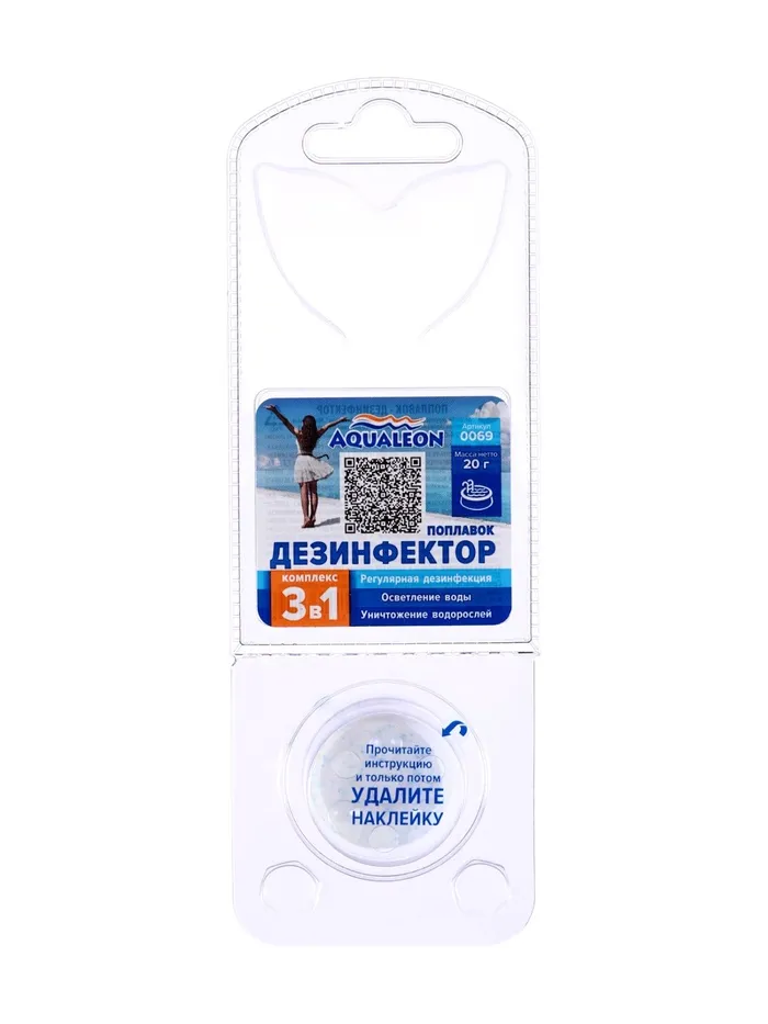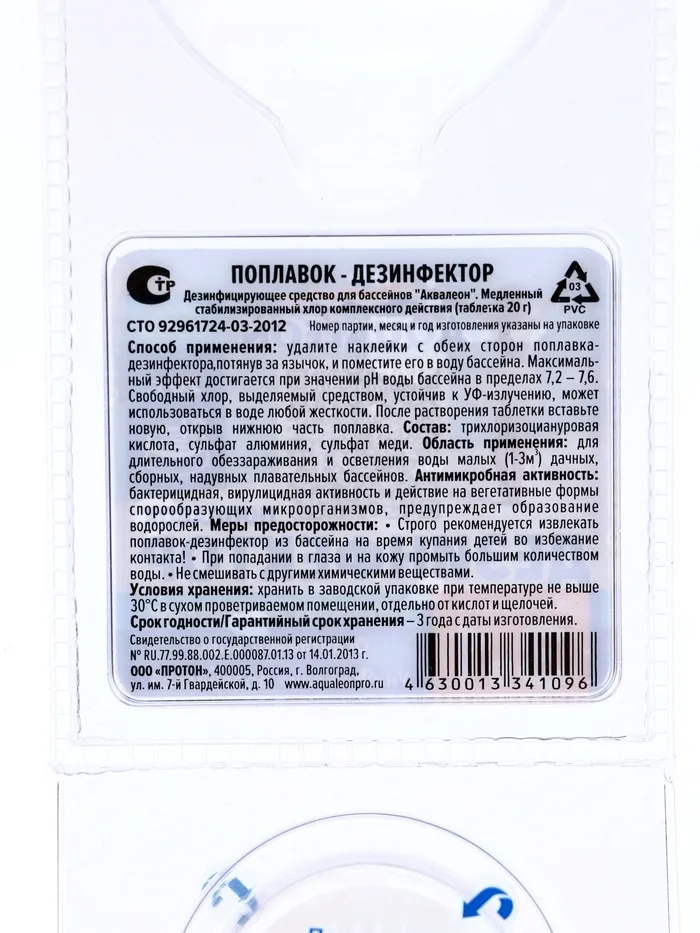 Меры предосторожности: строго рекомендуется извлекать поплавок-дезинфектор из бассейна на время купания детей во избежание контакта. При попадании в глаза и на кожу, промыть большим количеством воды. Не смешивать с другими химическими веществами.
