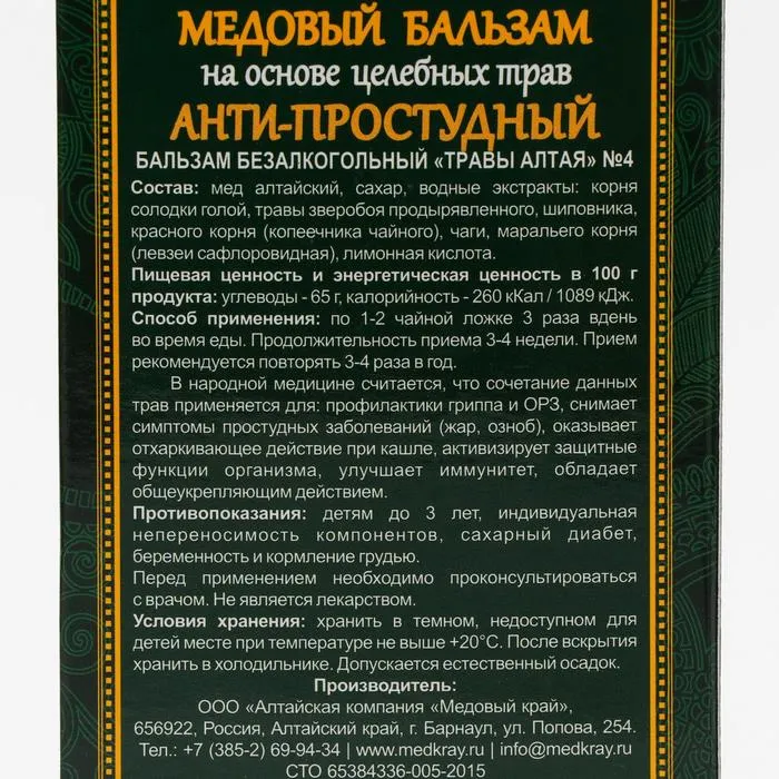 Состав: натуральный алтайский мёд, сахар, водные экстракты: солодки, зверобоя, шиповника, красного корня (копеечника чайного), чаги, маральего корня (левзеи сафроловидной). Лимонная кислота.