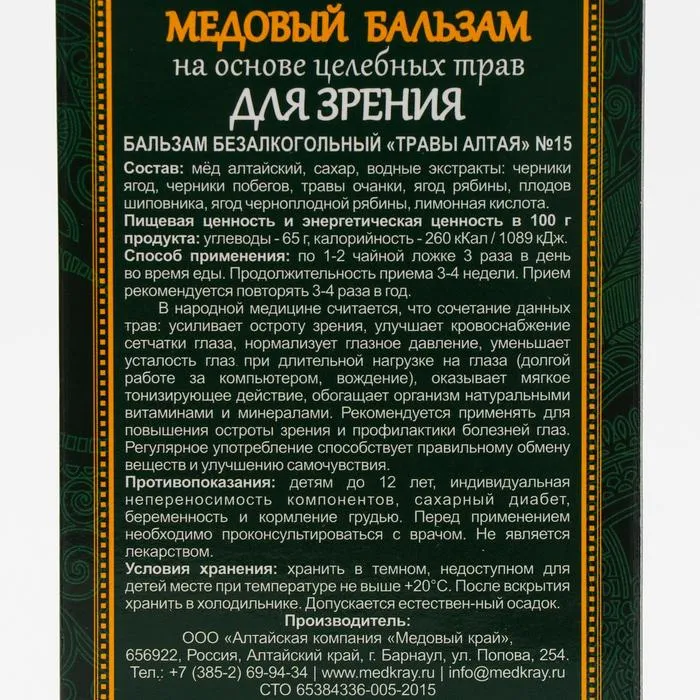 Состав: мёд натуральный алтайский, сахар, водные экстракты: черники ягоды, черники побег, травы очанки, ягоды рябины, плоды шиповника, ягоды черноплодной рябины. Лимонная кислота.