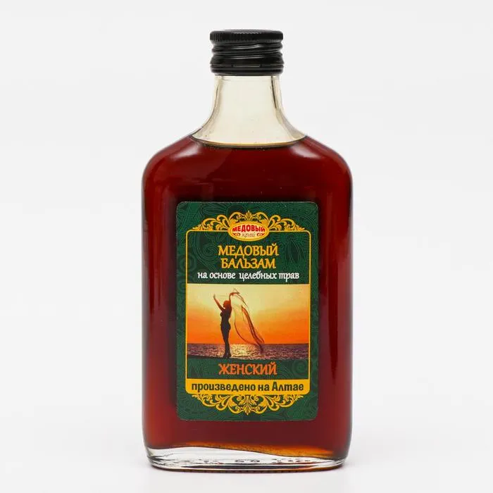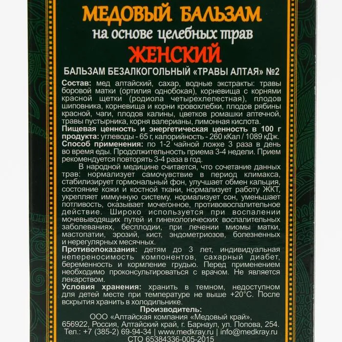 Алтайский бальзам медовый безалкогольный ЖЕНСКИЙ это комплекс натуральных трав Алтая. Бальзам нормализует самочувствие в период климакса, стабилизирует гормональный фон, улучшает обмен кальция, состояние кожи и костной ткани, нормализует работу ЖКТ, укрепляет иммунную систему, нормализует сон, уменьшает потливость, оказывает мочегонное, противовоспалительное действие. Широко используется при воспалении мочевыводящих путей и гинекологических воспалительных заболеваниях, бесплодии, при лечении миомы матки, мастопатии, эрозий, кист, эндометриозов, болезненных и нерегулярных месячных. Не является лекарством.