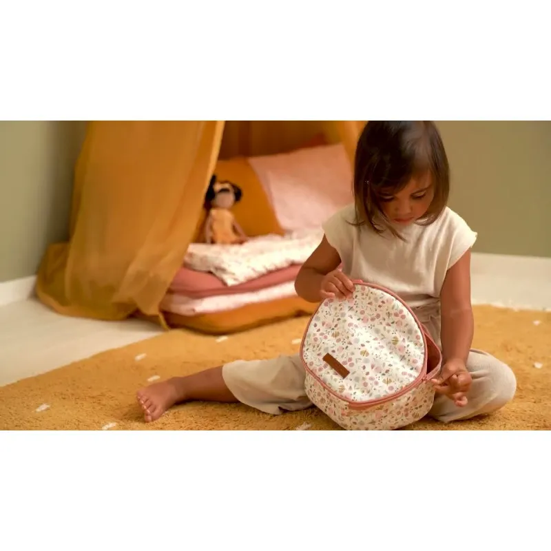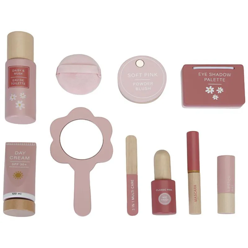 Красочная косметичка Little Dutch с цветочным узором и деревянными аксессуарами для красоты. Этот 10-частный игровой набор включает в себя духи, дневной крем, зеркало, палитру теней и лак для ногтей. Все игрушечные косметические средства изготовлены из FSC-дерева.