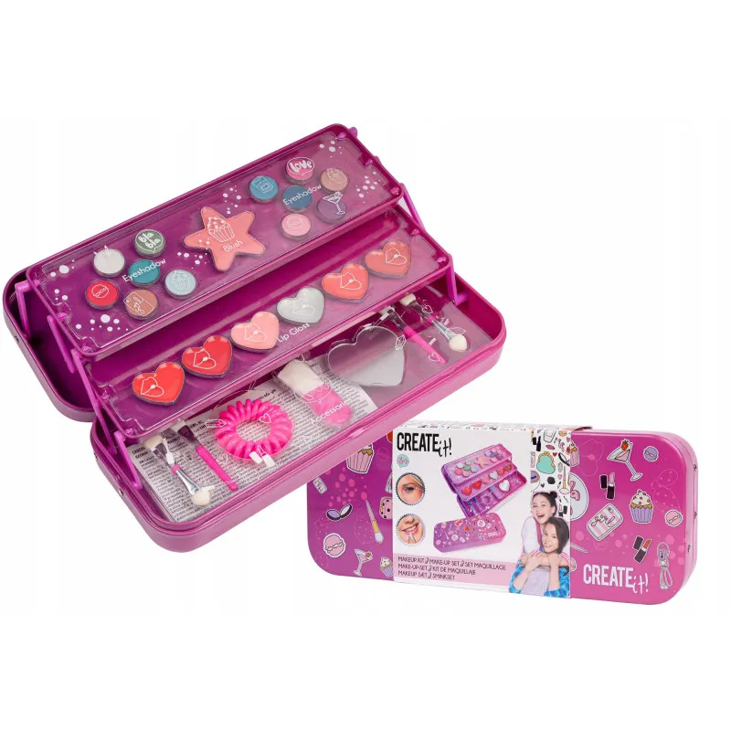 Набор макияжа Create It! – это идеальный выбор для юных модниц. В наборе 26 предметов: 12 оттенков теней для век, румяна, 6 блесков для губ, 5 кисточек для макияжа, зеркало и резинка для волос. Рекомендуется для детей от 6 лет. Пожалуйста, обратите внимание, что данный товар доступен только по предзаказу, а срок доставки составляет около 2 недель.