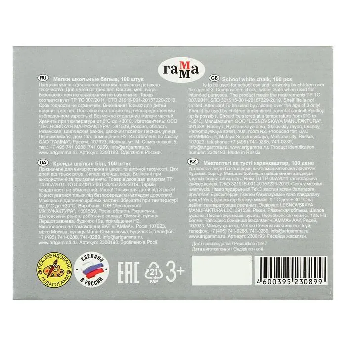 Школьные мелки ГАММА производятся по уникальной технологии и не имеют аналогов среди других производителей мела в Росссии. Мелки состоят на 95% из натурального мела и не содержат гипс в своем составе. Отличаются яркостью, мягкостью, не крошатся и не царапают покрытие.
