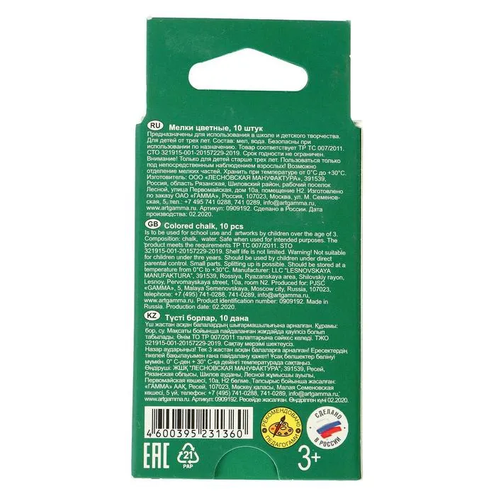 Школьные мелки ГАММА производятся по уникальной технологии и не имеют аналогов среди других производителей мела в Росссии. Мелки состоят на 95% из натурального мела и не содержат гипс в своем составе. Отличаются яркостью, мягкостью, не крошатся и не царапают покрытие.