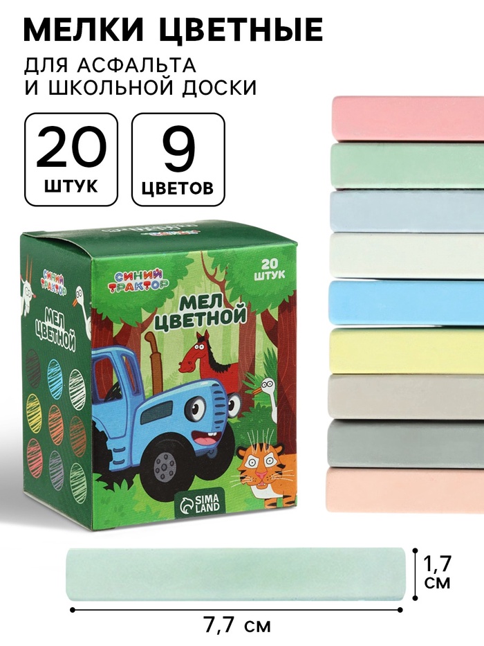 Мелки цветные школьные, 20 шт. «Синий трактор», прямоугольные — Характеристики