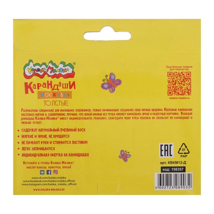 Мелки восковые 12 цветов, "Каляка-Маляка", толстые круглые — Характеристики