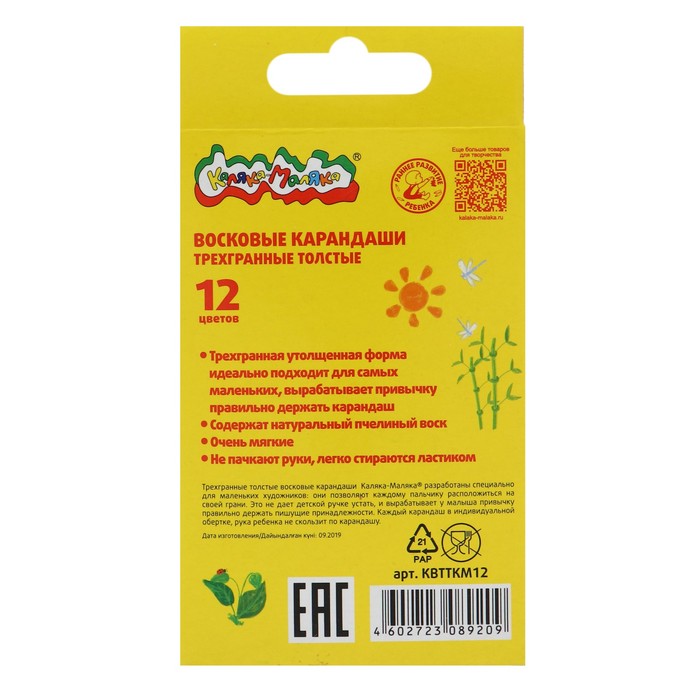 Мелки восковые 12 цветов, "Каляка-Маляка", трёхгранные — Характеристики