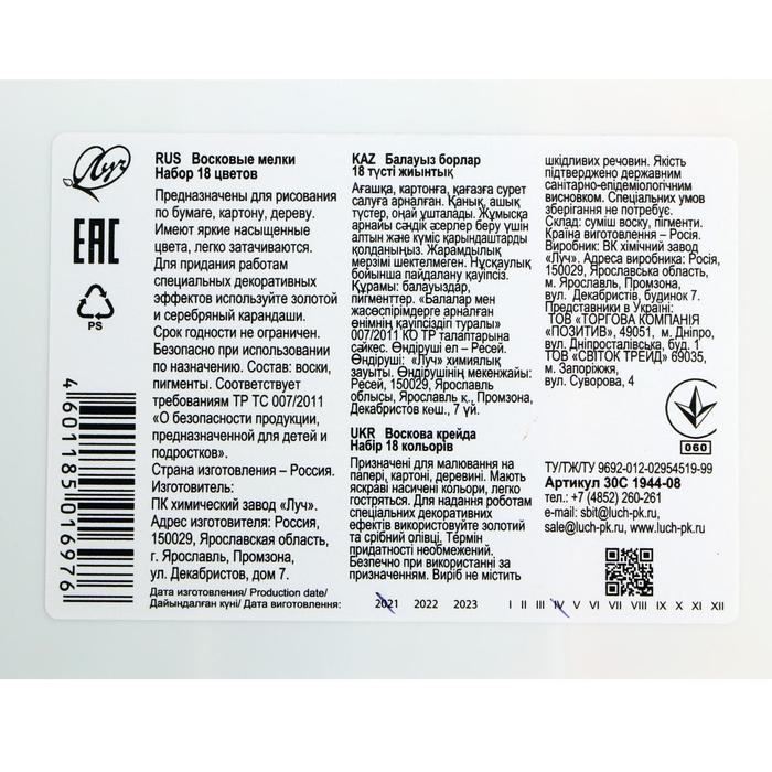Мелки восковые 18 цветов (16 классических + 1 золотой + 1 серебряный) «Волшебная палитра», круглые — Характеристики