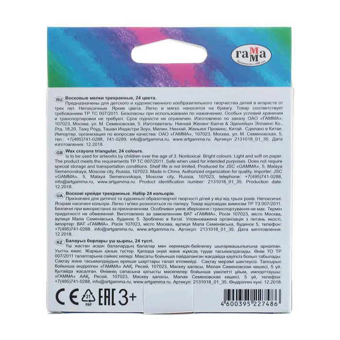 Мелки восковые 24 цвета Гамма "Классические", треугольные, европодвес 2131018_01_35 — Характеристики