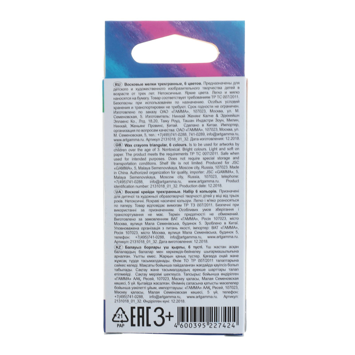 Мелки восковые 6 цветов, "Гамма" "Классические", треугольные, европодвес — Характеристики