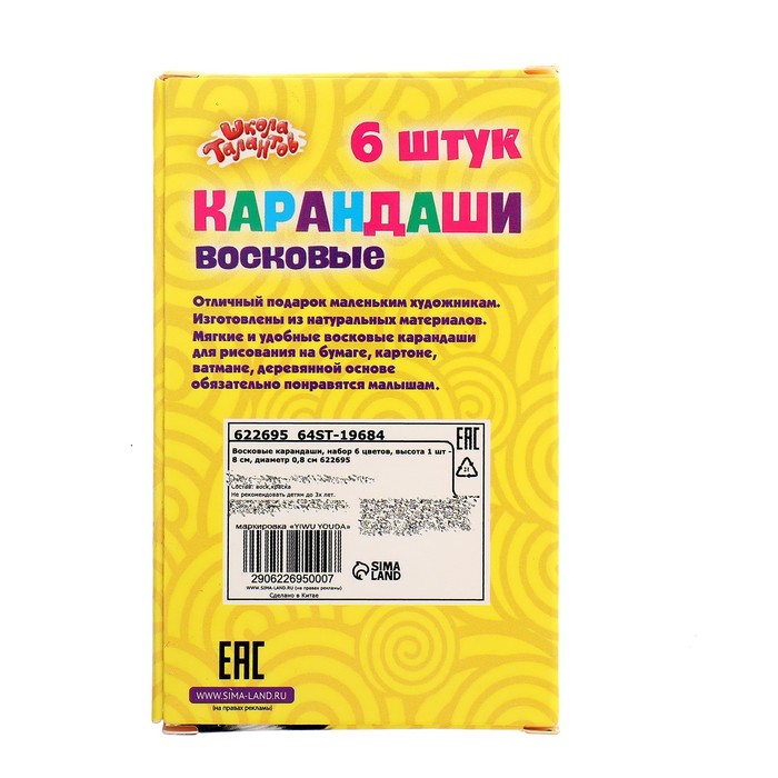 Мелки восковые, набор 6 цветов, высота 8 см, диаметр 0.8 см — Характеристики