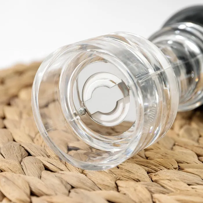 Мельница имеет стильный прозрачный цвет и удобную форму, которая делает ее комфортной в использовании. Она оснащена прочным керамическим механизмом помола, который обеспечивает длительный срок службы и не вступает в реакцию с продуктами. Мельница изготовлена из прочного пластика, что делает ее легкой и удобной в уходе.