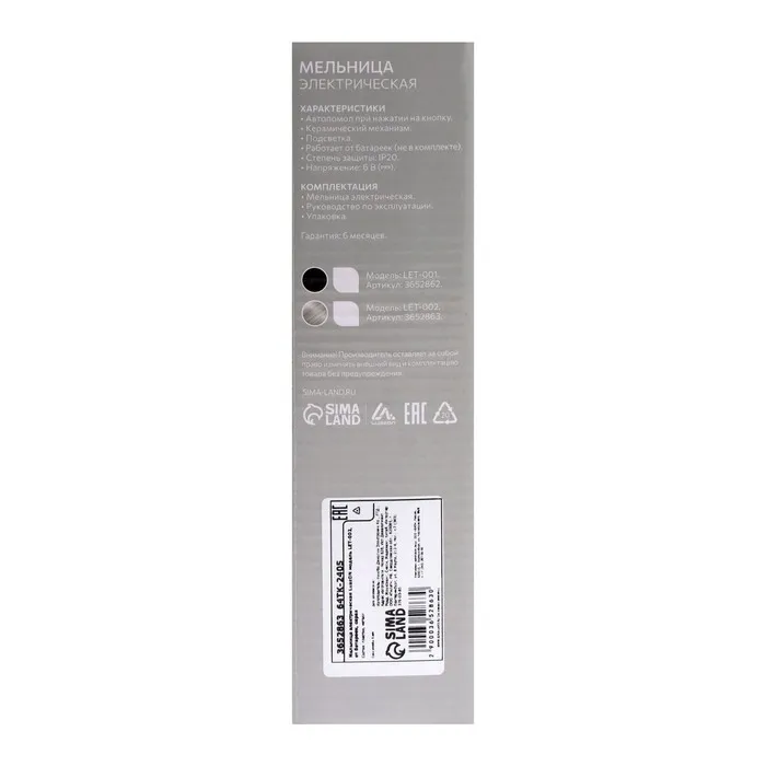 Мельница электрическая Luazon LET-002, металл, от батареек, серебристая — Характеристики