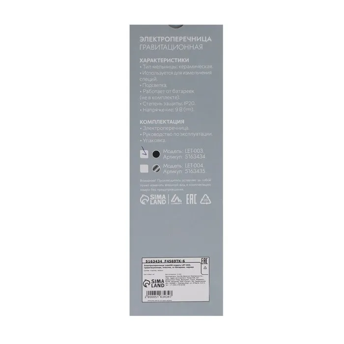 Мельница электрическая Luazon LET-003, гравитационная, пластик, от батареек, черная — Характеристики