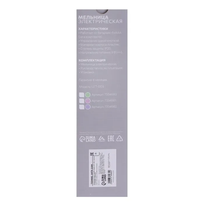 Мельница электрическая Luazon LET- 003, пластик, от батареек, сиреневая — Характеристики