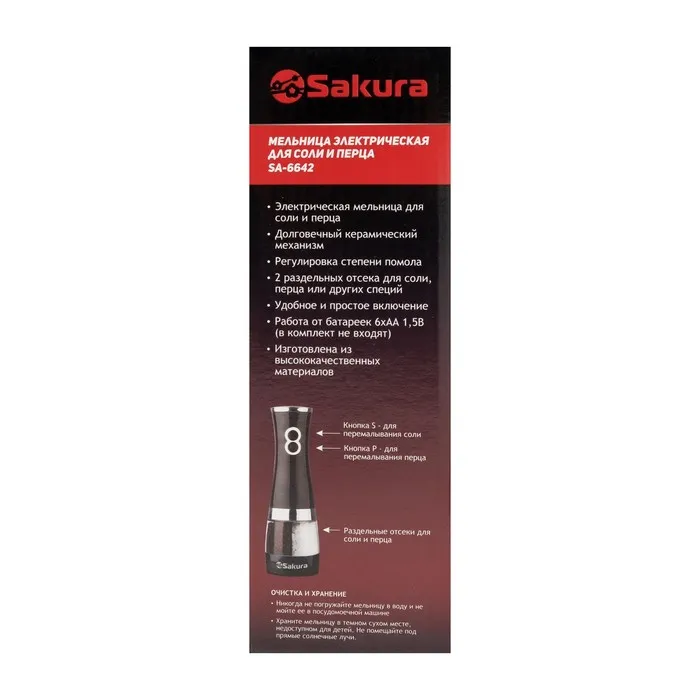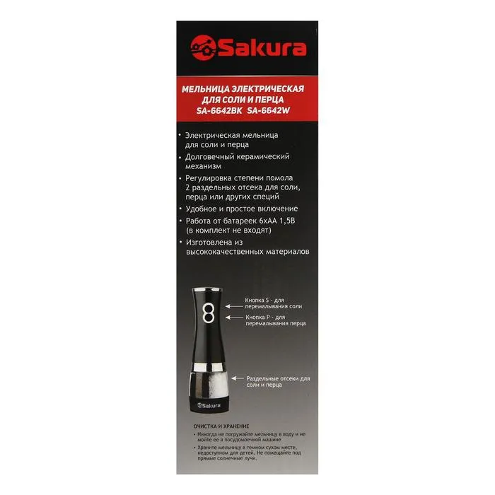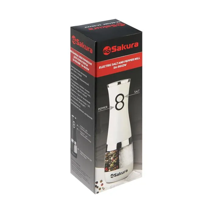 Электрическая мельница Sakura SA-6642BK — это стильное и эффективное устройство для помола специй. Механизм выполнен из высококачественной керамики, что гарантирует долговечность и точность работы. Корпус мельницы изготовлен из прочного пластика, который придаёт ей лёгкость и удобство в эксплуатации. Мельница оснащена функцией регулировки степени помола, позволяя настроить устройство под ваши предпочтения — от мелкого до крупного помола. Sakura SA-6642BK — отличный выбор для кухни, обеспечивающий удобство и высокое качество помола.