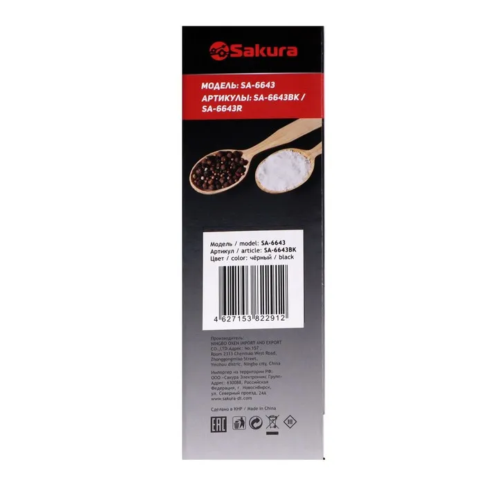 Мельница электрическая Sakura SA-6643BK, подсветка, чёрная — Характеристики