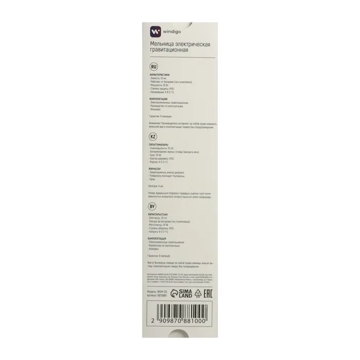 Мельница электрическая Windigo WGM- 02, гравитационная, 25 Вт,70 мл, металл — Характеристики