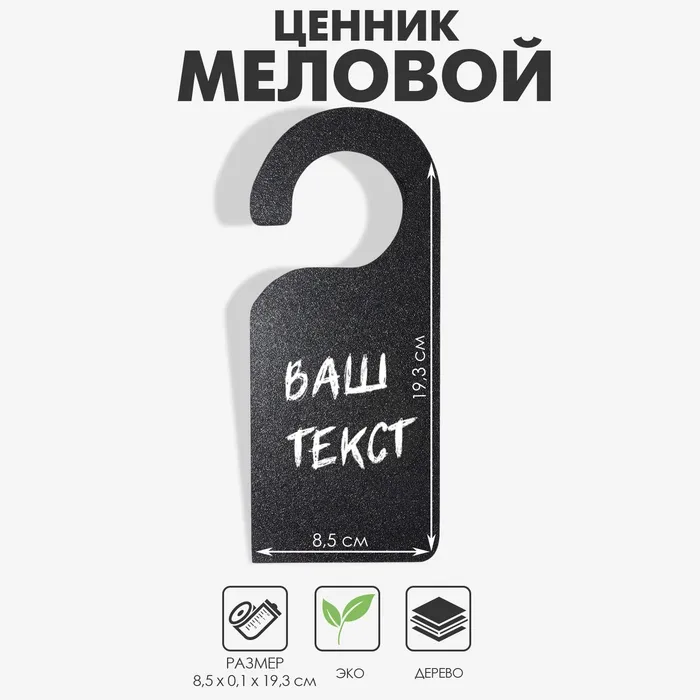 Ценник оснащен удобным крючком-вешалкой, что позволяет легко и быстро закрепить его на полке или стойке. Меловая поверхность ценника дает возможность многократно изменять цену или информацию, просто стирая и снова пишя, что делает его удобным и экономичным вариантом для любого бизнеса.