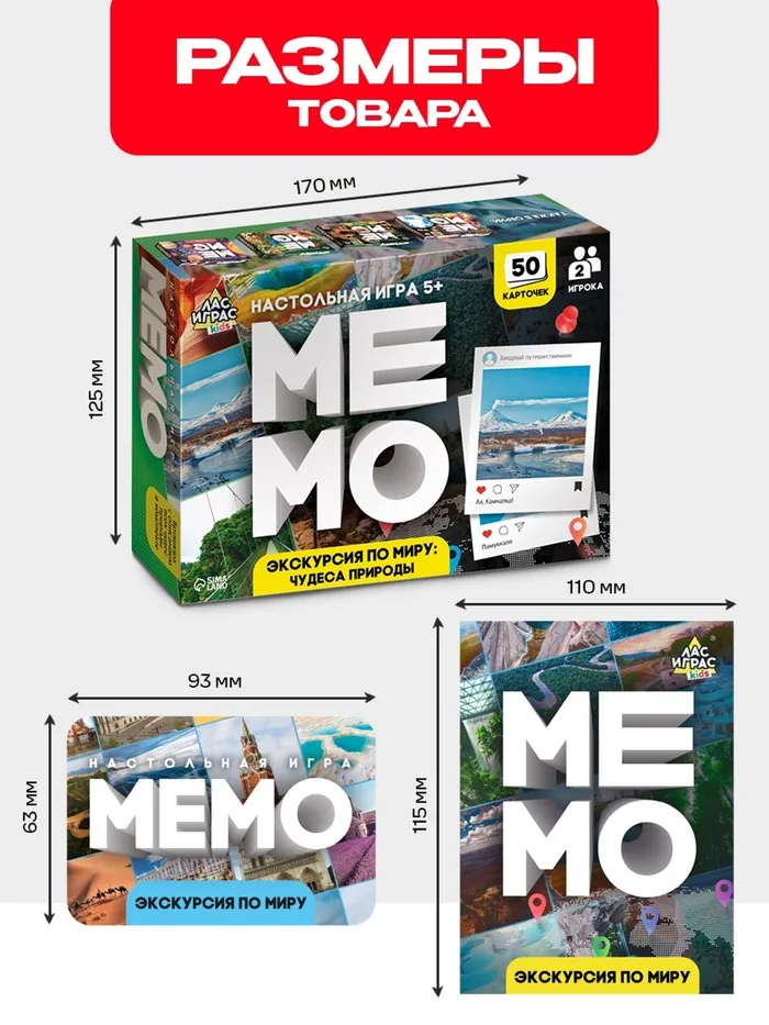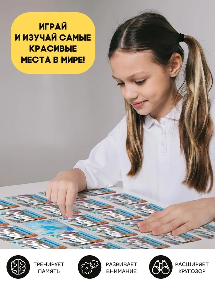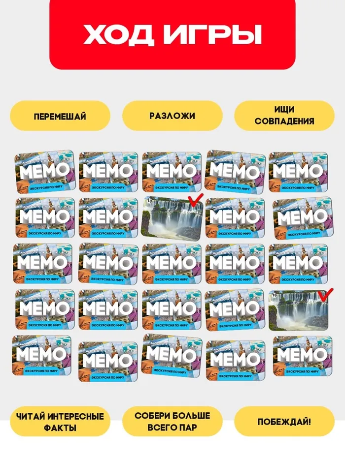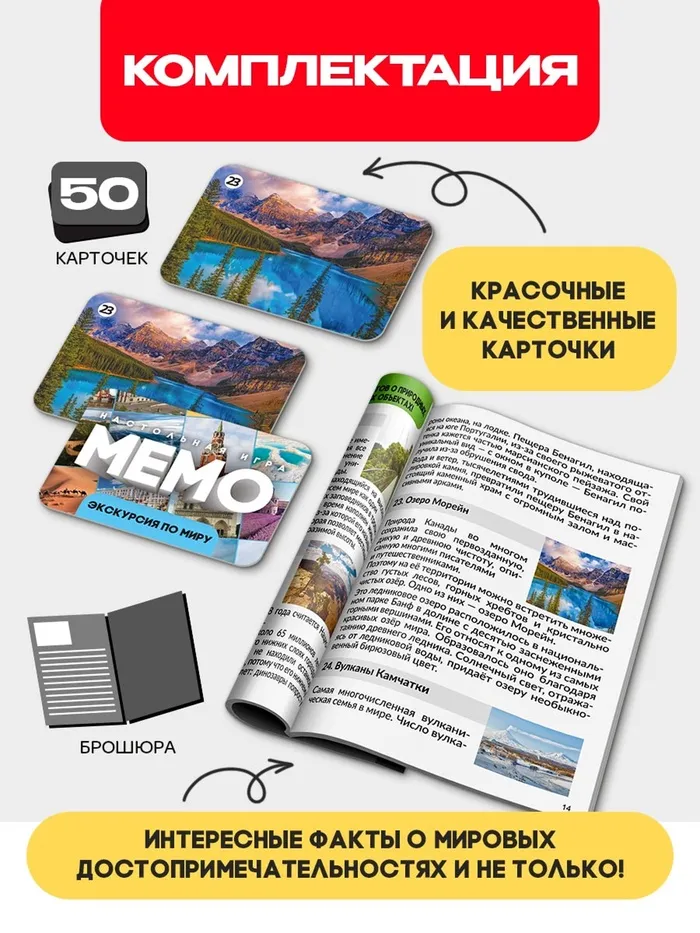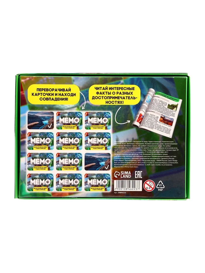Мемо «Экскурсия по миру. Чудеса природы» — это настольная игра, которая сочетает в себе развлечение и обучение. Соберите пары карточек с изображениями природных чудес, тренируя память и расширяя кругозор. Игра подходит для двух участников и станет отличным способом провести время с пользой.