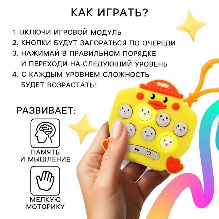 Развивающая мемори игра «Утята» способна развлечь и отвлечь ребёнка в нужную минуту. Суть игры — нажимать на кнопки, которые по очереди загораются. Игрушка издаёт звуки во время игры.