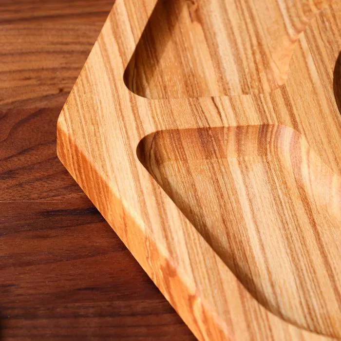 Деревянная менажница имеет свой уникальный стиль и красоту. Она изготовлена из натурального дерева, что придает ей шарм и теплоту.