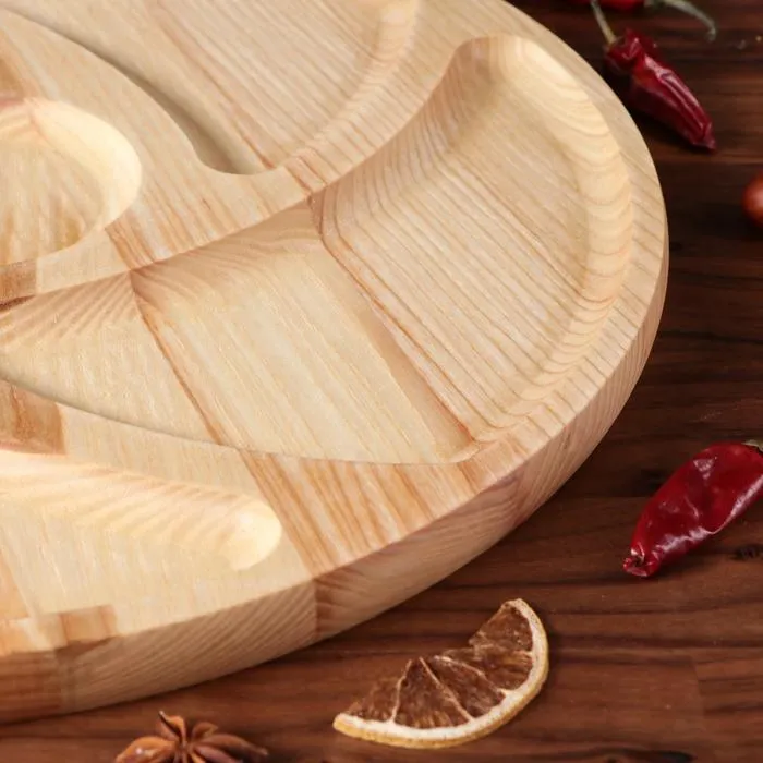 Деревянная менажница имеет свой уникальный стиль и красоту. Она изготовлена из натурального дерева, что придает ей шарм и теплоту.