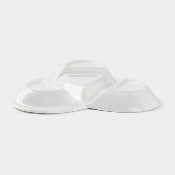 Керамическая тарелка с четырьмя секциями станет стильным аксессуаром для сервировки закусок, сыров или специй. Белоснежная поверхность подчеркивает лаконичность формы, а фигурный силуэт вдохновлен узором трикветр, добавляя посуде культурный акцент. Практичная ширина 21 см и компактная высота 2,5 см делают её удобной для хранения в шкафу или подачи на стол.