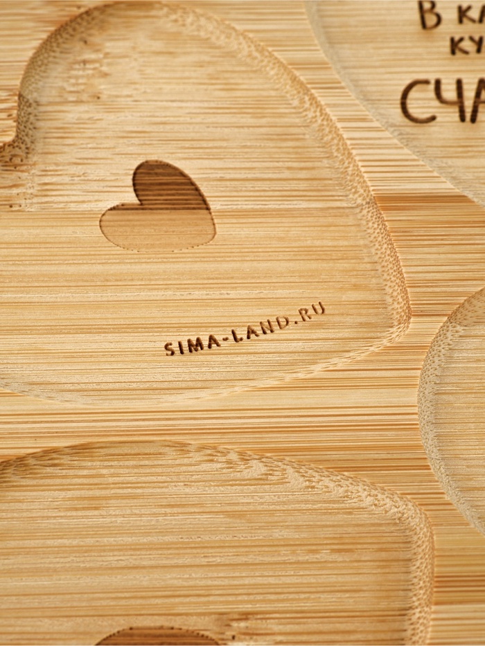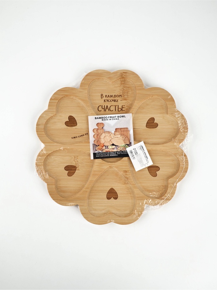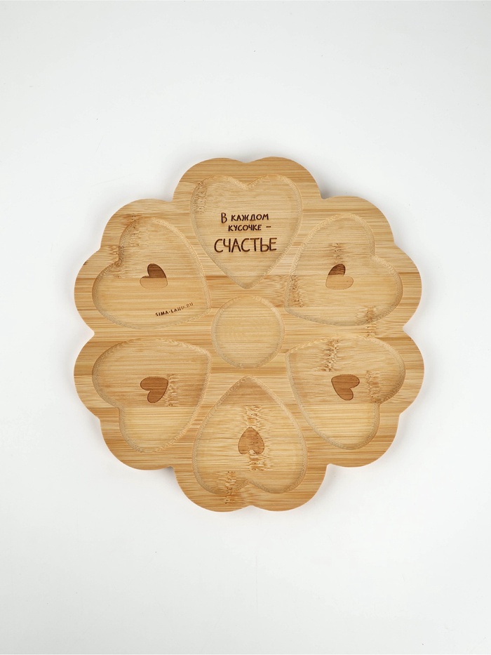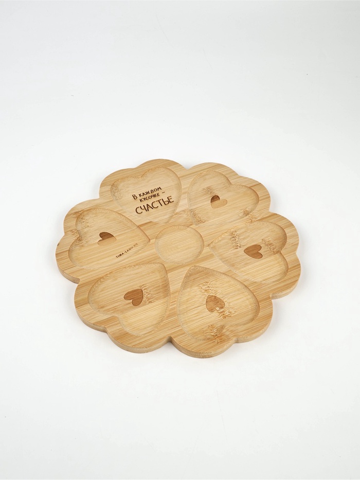 Менажница «Любовь» — это признание, вырезанное в бамбуке. Её бежевая поверхность, как страница в блокноте перед первым признанием, и семь ячеек в форме сердец — не декоративный приём, а метафора: счастье редко бывает цельным. Оно складывается из кусочков — маленьких, разных, но своих.