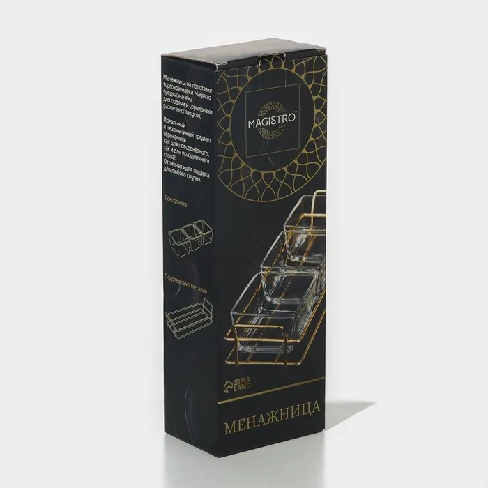 Менажница Magistro «Званый прием», 3 секции, 250 мл, 31×9×6 см, стекло, прозрачная, золотистая — Характеристики