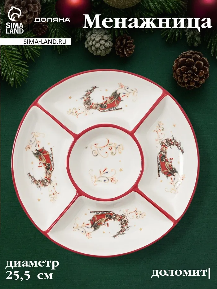 Менажница новогодняя Доляна «Сани Деда Мороза», 5 ячеек, 25.5×3.1 см, доломит, белая — Характеристики